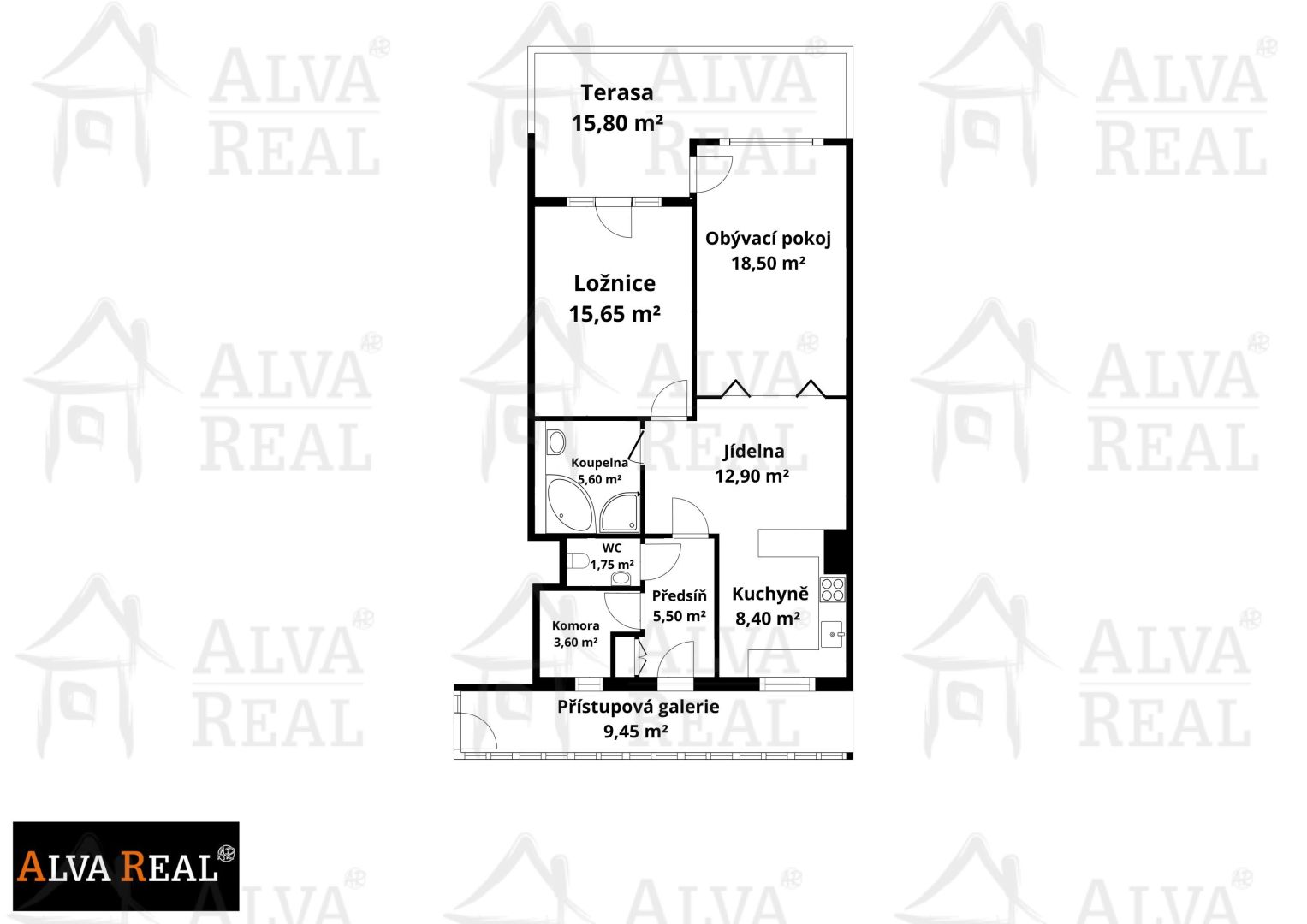 Dispozice: Obývací pokoj 18,50 m²; ložnice 15,65 m²; jídelna 12,90 m²; kuchyně 8,40 m²; koupelna 5,60 m²; předsíň 5,50 m²; komora 3,60 m²; WC 1,75 m²; terasa 15,80 m² a přístupová galerie 9,45 m².
